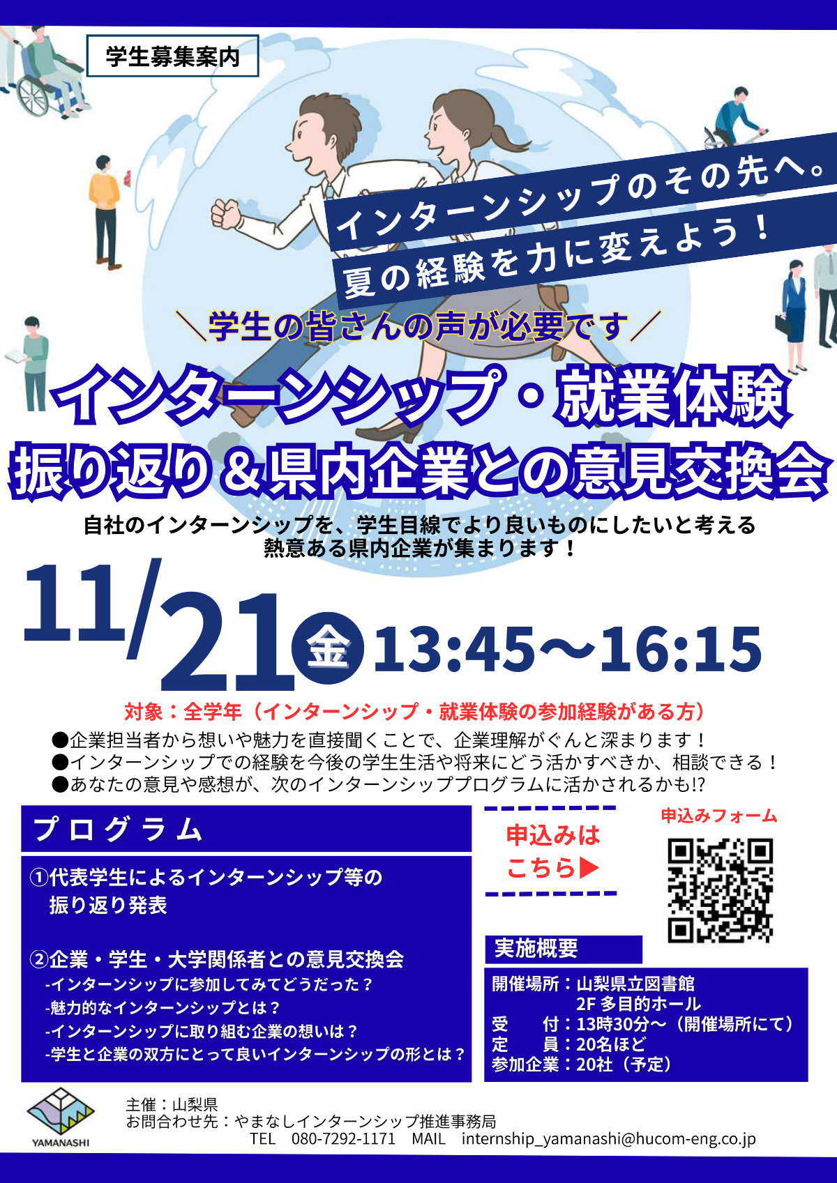 本事業では、大学等との連携を積極的に行い、本事業を通じた学生の学びを所属校へ提供し、包括的な学生支援、教育効果の高いインターンシップ等の実現を目指したいと考えております。本事業にご協力いただくことにより、把握することが難しい正課外のインターンシップ等の参加状況を知ることができます。また、本事業で実施するインターンシップ等に係るイベント等の周知へのご協力をお願いいたします。
