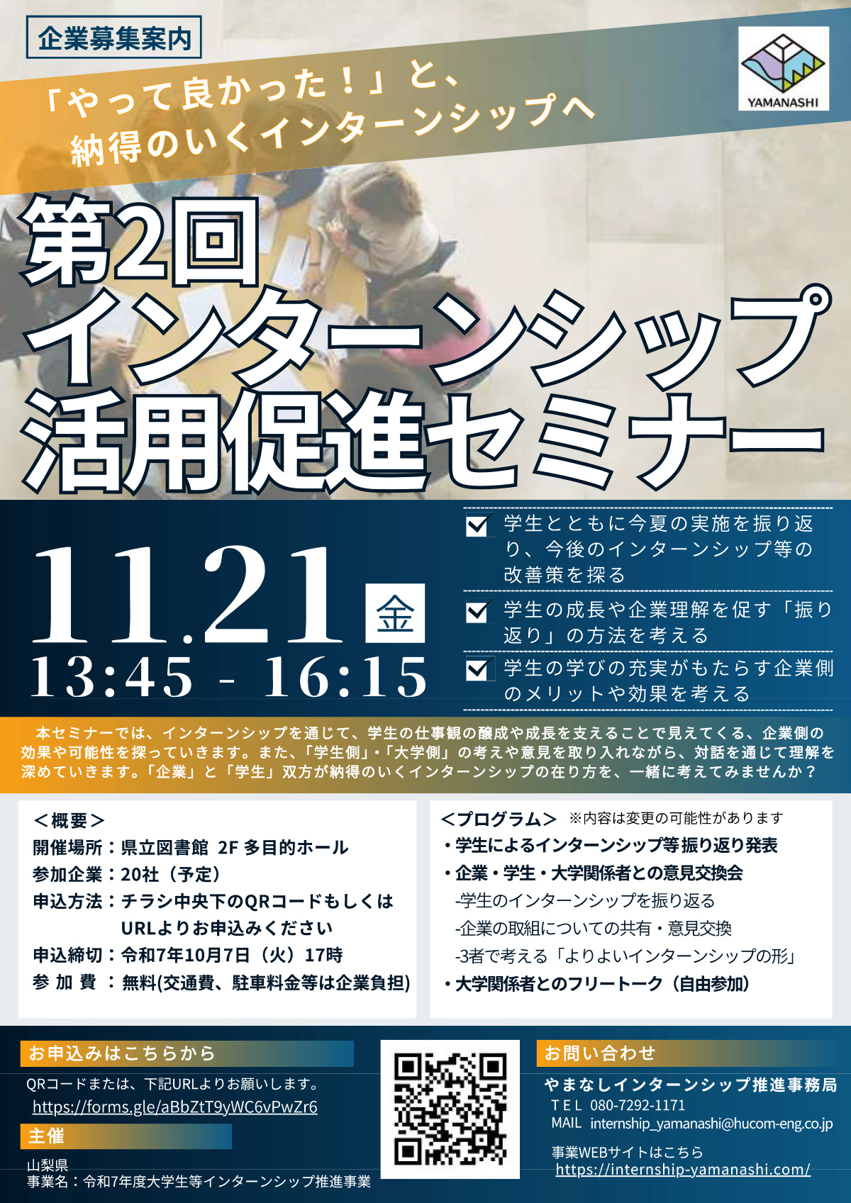 インターンシップ等の理解促進・企業間での情報交換会・プログラム作成支援等のセミナーを開催いたします。また、セミナー後には、インターンシップ等のプログラム作成支援を希望する企業に対し、専門アドバイザーを派遣します。